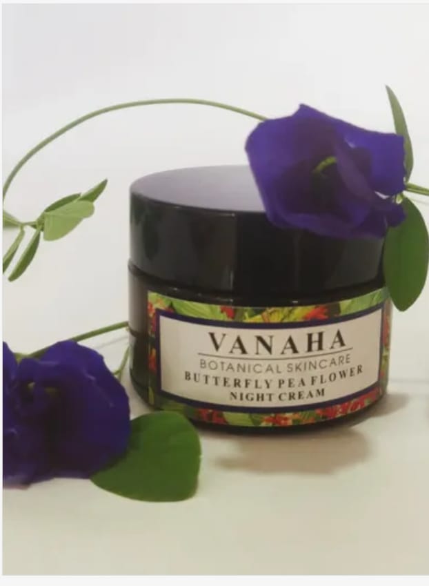 Vanaha's Butterfly Pea flower Night Cream has been formulated by integrating butterfly pea flower extract and co enzyme Q10 along with natural butters such as bacuri, cocoa, mango and a blend of exotic oils. This cream has plenty of benefits. It treats dry skin, reduces signs of ageing caused by sun exposure, reduces wrinkles, and corrects dark spots and hyperpigmentation. It's an anti-aging cream that mimics our skin's sebum lipids thus replenishing our skin with plant lipids and nutrients. The cream is also antimicrobial and full of antioxidants (carotenoids) which makes it a powerful free radicals scavenger that helps to greatly reduce the signs of ageing. We have improvised our Butterfly Pea Flower Night cream by adding Red French Marigold Extract to it.